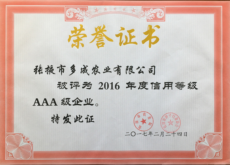 | 熱烈祝賀張掖市多成農(nóng)業(yè)有限公司被評為2017年度信用等級AAA級企業(yè)! | ||