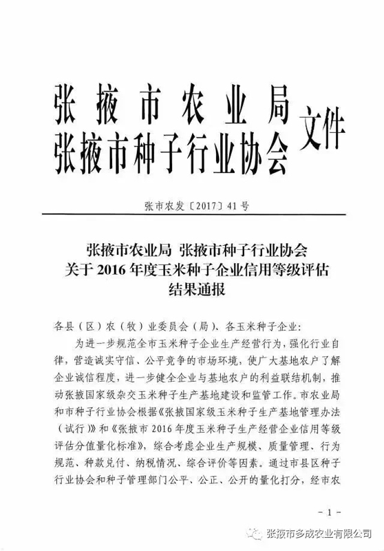 熱烈祝賀張掖市多成農(nóng)業(yè)有限公司被評為2017年度信用等級AAA級企業(yè)。 2017年2月24日,張掖市農(nóng)業(yè)局、張掖市種子行業(yè)協(xié)會公布的《2016年度玉米種子企業(yè)信用等級評估結(jié)果》中,張掖市多成農(nóng)業(yè)有限公司被評為2016年度信用等級AAA級企業(yè)。 |
